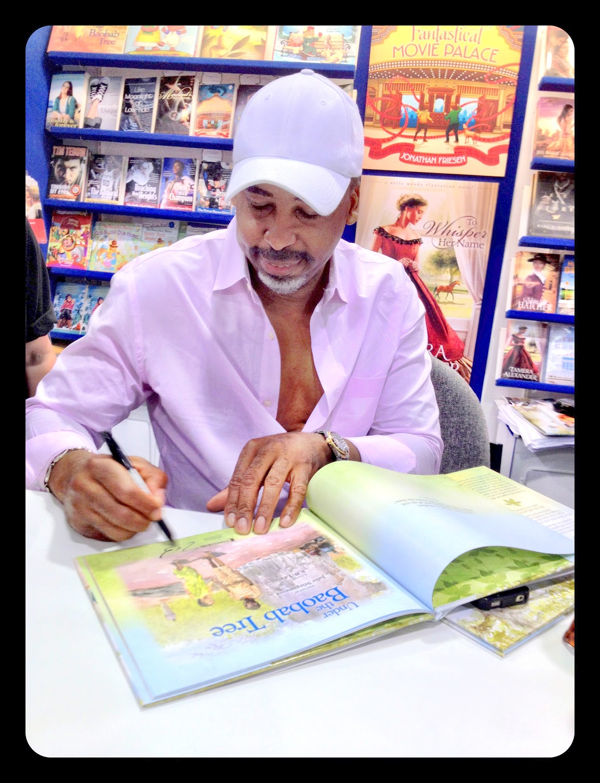E.B. Lewis, illustrator of Under the Baobab Tree signing our book at the Zondervan booth
